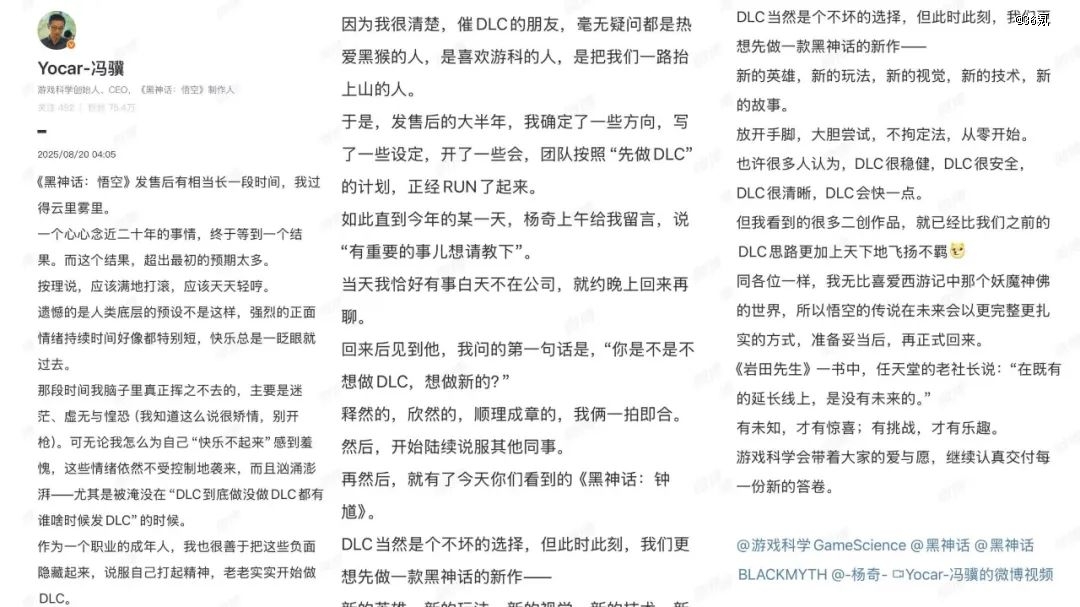 无数玩家在通关甚至多周目后,开始期待游戏发售新的DLC(额外内容)。此次科隆游戏展上,游戏科学并没有让玩家如愿,但制作人冯骥通过微博对此进行了说明。