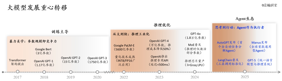 自2017年Transformer架构提出至今,大模型发展的重心也在不断发生转移,起始阶段是大模型的训练主导,核心目标在于通过扩大参数量和数据规模提升模型能力。之后大模型落地应用面临成本与效率瓶颈,推理专用芯片、MoE等与推理强相关的技术逐渐普及。Agent的出现推动了AI技术从单一任务执行向复杂决策与交互的转变,成为了AI应用最 具想象力的板块。